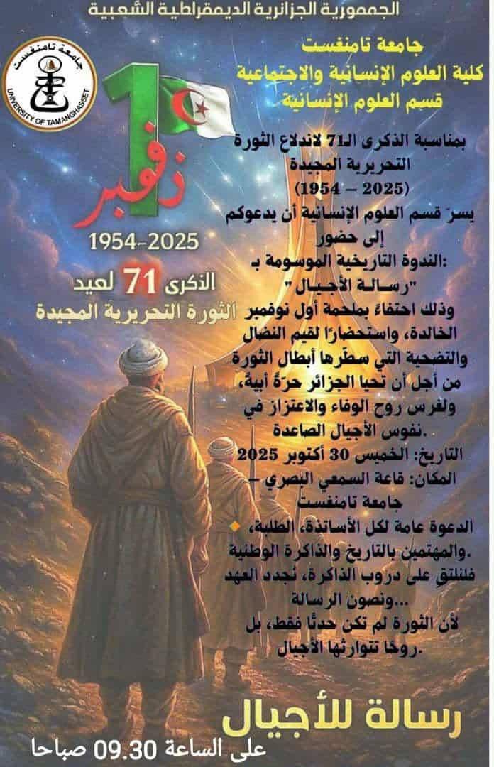 في إطار إحياء الذكرى الحادية والسبعين لاندلاع الثورة التحريرية المجيدة 🇩🇿🇩🇿 ، تنظم كلية العلوم الإنسانية والاجتماعية بجامعة تمنراست، ممثلة بقسم العلوم الإنسانية، فعالية علمية وثقافية موسومة بـ “رسالة للأجيال”، وذلك يوم الخميس 30 أكتوبر 2025 على الساعة 09:30 صباحًا.