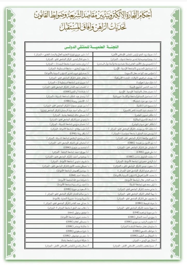 “أحكام التجارة الإلكترونية بين مقاصد الشريعة وضوابط القانون: تحديات الراهن وآفاق المستقبل”، وذلك يوم الخميس 28 شوال 1447 هـ الموافق لـ 16 أفريل 2026، بمسجد سيدي عبد الجبار التجاني بعين ماضي، ولاية الأغواط